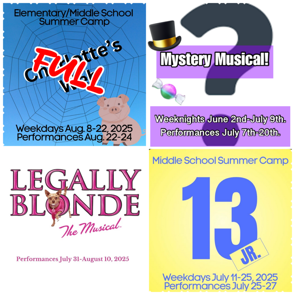 While Charlottes Web Summer Camp is indeed full already, we’ve still got openings for young kids in our Mystery Musical! We also have space in our middle school camp, 13 The Musical (6th-8th grade) and high school show, Legally Blonde (9th-12th)!